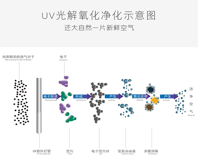 UV燈管在啟動(dòng)之後(hòu),能夠產生大量的紫外線光(guāng)速對惡臭氣體進行照(zhào)射,將惡臭氣體降解(jiě)轉化,變成低分子化合物(wù)【UV+O2→O-+O*(活性氧)O+O2→O3(臭氧)】,例如變成CO2、H2O等無害氣體,達到有效的去除異味(wèi)的(de)效果,且不會產生二次汙染(rǎn)。例如變成CO2、H2O等無害氣(qì)體,達到有效的去除異味的效果,且不會產生二次汙染。
