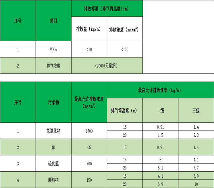 廢氣排放標準執行《大氣汙(wū)染物綜合排放標準》(GB16297-1996)、《惡臭物質排放標準》(GB14554-93)二級標準,排放標準如下(xià):